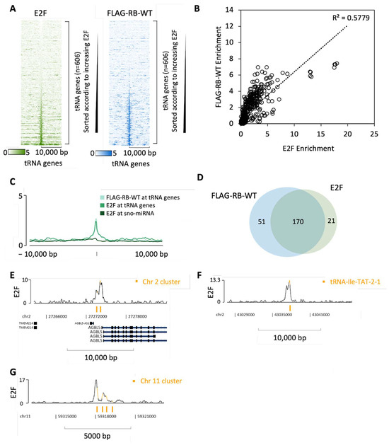 RB lacks a DNA-binding domain and is recruited to genomic sites through interaction with transcription factors that recognize specific DNA sequences, the best-documented of which is E2F. Although tRNA genes have not, to our knowledge, been reported as E2F targets, ChIP-seq revealed that ~190 are bound by E2F1 in RPE1 cells; furthermore, a heatmap with RB occupancy sorted according to the strength of E2F1 binding demonstrates strong correlation at tRNA loci (Figure 6A). Indeed, RB is recruited to most of the tRNA genes that are close to sites bound by E2F1, whereas minimal enrichment of either was detected at the majority of miRNA and snoRNA genes (Figure 6B–D). In some cases, both the tRNA gene(s) and the E2F1 site(s) are located within the promoter region of a protein-coding gene; for example, the binding of RB and E2F1 coincide with the tRNA-Tyr-GTA-2-1 and tRNA-Ala-AGC-8-1 genes upstream of the AGBL5 gene on chromosome 2 (Figure 6E). However, E2F1 and RB can also be found at tRNA genes located far from protein-coding genes, such as the isolated tRNA-Ile-TAT-2-1 gene on chromosome 2 (Figure 6F) and a cluster of four tRNA genes on chromosome 11 (Figure 6G). Mining of public ChIP-seq data using ChIP-Atlas (http://chip-atlas.org) [104,105] reveals an additional 12 cell lines in which E2F1 has been detected at the tRNA-Ile-TAT-2-1 gene (Supplementary Figure S3). The well-established ability of DNA-bound E2F1 to recruit RB to its target sites offers an explanation for the detection of RB at many tRNA genes.