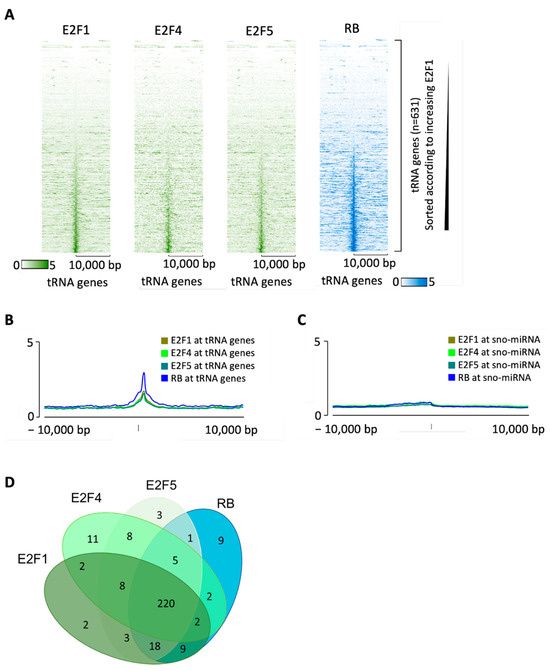 E2F1 is expressed primarily in proliferating cells and does not accumulate in quiescent cells, where E2F4 and E2F5 are the most abundant members of the E2F family [12]. If tDNA occupancy by RB in quiescent cells (Figure 3) is also mediated by E2F, then E2F4 and/or E2F5 are likely to substitute for E2F1. The encyclopedia of DNA elements (ENCODE) contains ChIP-seq datasets for RB, E2F1, E2F4 and E2F5 in the erythroid cell line K562 (available at www.encodeproject.org/), which reveal that each of these proteins can be found at many tDNAs (Figure 7A,B). Comparable enrichment is not detected at the majority of miRNA and snoRNA genes (Figure 7C). There is substantial overlap between the tDNAs bound by these four proteins (Figure 7D). This is also evident from Figure 7A, where the tDNAs are sorted in each heatmap according to the strength of E2F1 binding; it is evident that the orders of binding of E2F4, E2F5 and RB closely follow that of E2F1. Under these conditions, ~30% of tDNAs are occupied above threshold by at least one of the three E2F family members tested and binding by RB is detected at 87% of these. Of the 266 tDNAs that recruit RB above threshold under these conditions, ~97% bind one or more of E2F1, E2F4 and E2F5. These data suggest that E2F may be primarily responsible for the association of RB with tRNA genes, although alternative recruitment mechanisms are also likely in at least some cases.