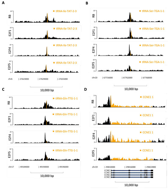 Binding of RB, E2F1, E2F4 and E2F5 at various genes. (A–D) Representative fill tracks showing RB, E2F1, E2F4 and E2F5 binding at hg38 tRNA-Ile-TAT-2-3 (A), tRNA-Ser-TGA-1-1 (B), tRNA-Gln-TGG-1-1 (C) and cyclin E (CCNE1 (D)) genes in K562 cells. Genes are highlighted in orange. Note different y-axis scales between genes and proteins.