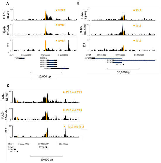 We extended our analyses to include the RMRP and 7SL RNA genes that require pol III for their transcription because they are implicated in carcinogenesis. RMRP is a non-coding RNA of 267 nucleotides that promotes cell cycle progression and proliferation [82,83,85]. It contributes to the processing of pre-rRNA and also associates with the catalytic subunit of telomerase to form an RNA-dependent RNA polymerase [83,107,108,109,110]. Germline loss of the RMRP gene can cause an inherited syndrome involving compromised growth [111,112]. The RMRP gene undergoes focal amplification in several tumor types and somatic mutations in its promoter lead to elevated expression in breast cancers [84,86]. A peak of E2F1 occupancy occurs at the RMRP gene in RPE1 retinal cells and this co-localizes with a site of RB recruitment (Figure 9A). The RB∆cdk mutant is recruited more strongly than wild-type RB, consistent with the ability of CDK-mediated phosphorylation to inhibit its binding to E2F [30]. ChIP-Atlas shows that the RMRP gene is bound by E2F1 in ten additional cell types besides RPE1 and is also bound by E2F4 and E2F5 in K562 cells (Supplementary Figure S4). In addition, this gene is bound in IMR90 cells by p107, which interacts preferentially with E2F4 [12].