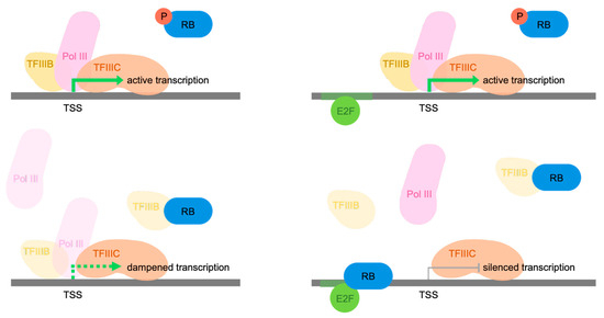 - Hirsch, H.A.; Gu, L.; Henry, R.W. The retinoblastoma tumor suppressor protein targets distinct general transcription factors to regulate RNA polymerase III gene expression. Mol. Cell Biol. 2000, 20, 9182–9191. [Google Scholar] [CrossRef] [PubMed][Green Version]