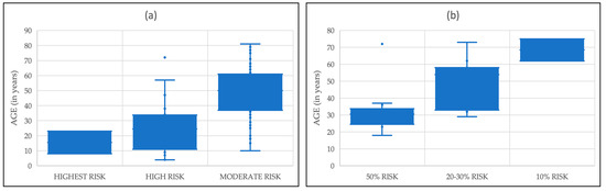 Age at diagnosis of (a) MTC in relation to ATA risk classification; (b) PCC in relation to ATA incidence risk.