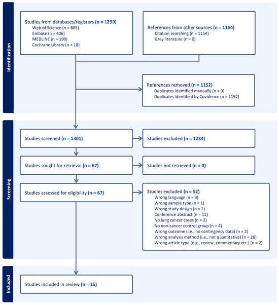 The results of the database searches and the subsequent selection process are illustrated in Figure 1. The initial searches, carried out in Embase, Medline, Web of Science, and Cochrane Library, identified 1299 potentially eligible records. Forward and backward citation searches of the 15 included studies resulted in 1154 additional references, many of which were duplicates. A total of 1234 references were eliminated based on title and abstract screening, which left 67 studies eligible for full-text assessment. Eventually, 15 studies were included in the review.