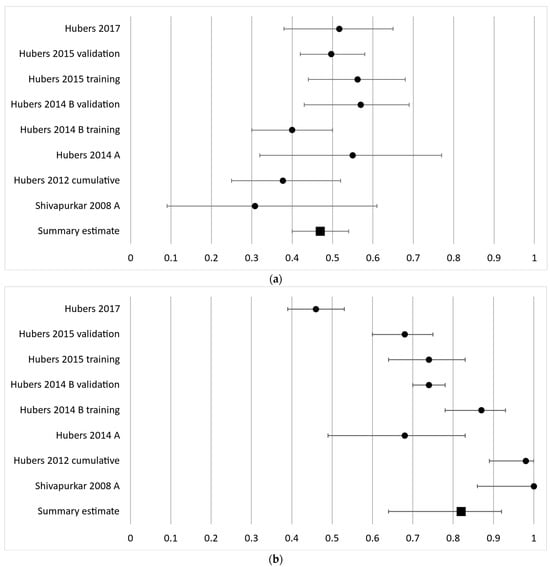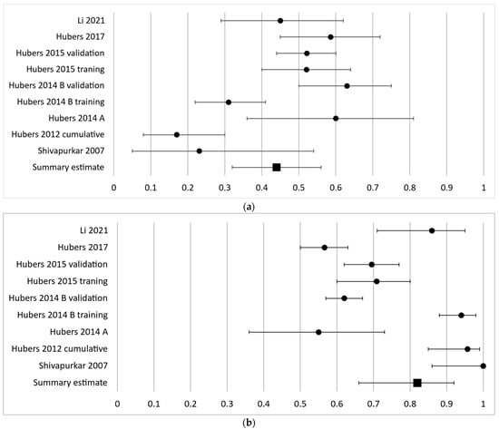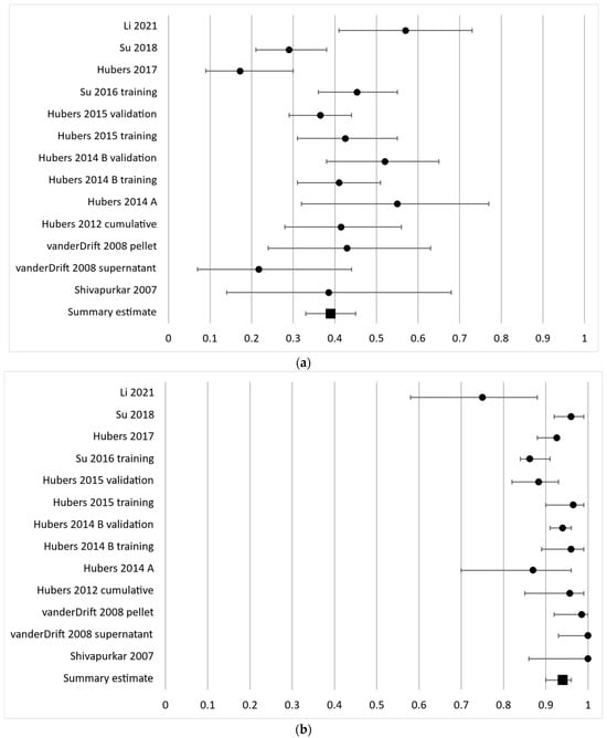 Forest plot of sensitivity (a) and specificity (b) for the most frequently analyzed gene, RASSF1A. The black circles represent the diagnostic performance estimates, and the error bars represent the calculated 95% confidence intervals. The black square represents the summary estimate for all independent cohorts [,,,,,,,,,].