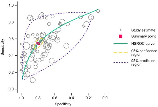 A meta-analysis of the comprehensive range of genes analyzed in all independent cohorts resulted in 87 discrete data points and summary sensitivity and specificity estimates of 54.3% (95% CI 49.4–59.2%) and 79.7% (95% CI 75.0–83.7%), respectively. The corresponding diagnostic odds ratio was 4.7 (95% CI 3.8–5.7). The area under the HSROC curve was 0.71 (95% CI 0.67–0.75), and the 95% confidence region as well as the 95% prediction region are illustrated in Figure 5. Two of the less frequently investigated genes, SOX17 and TAC1, showed a high diagnostic sensitivity >85% with a corresponding specificity of >70% in three studies [,,]. The comprehensive contingency data can be accessed in Supplementary Table S3, and the HSROC graph with an ID for each data point can be viewed in Supplementary Figure S2 and Table S4.