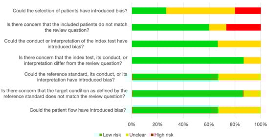 We used the QUADAS-2 checklist to evaluate the risk of bias in the included studies as recommended for test accuracy studies by the Cochrane Handbook for Systematic Reviews of Interventions []. The studies were of an acceptable quality overall, but issues in the “Patient selection” domain were frequent (Figure 6). Only two studies received “Low risk” in all seven judgments across the four domains [,]. The comprehensive quality assessments are reported in the Supplementary Materials (Tables S5–S9).
