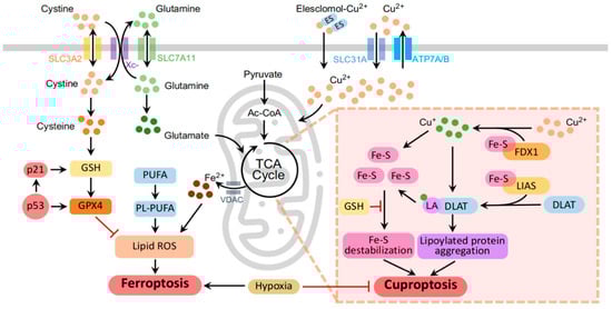 Mitochondria act as potential metal pools, and the mitochondrial respiratory chain works as an oxygen sensor under hypoxic conditions. Due to their distinct mechanisms related to mitochondrial metabolism, ferroptosis and cuproptosis show distinct vulnerabilities when exposed to hypoxia [80,96]. Sorafenib and erastin, known as ferroptosis inducers, enhance protein lipoylation by inhibiting FDX1 degradation via mitochondrial proteases. Simultaneously, they reduced intracellular copper chelator GSH synthesis by blocking cystine imports [11]. Iron drives lipid peroxidation, culminating in ferroptosis, whereas copper binds and disrupts DNA, activating E2D2-induced protein ubiquitination and degradation. Additionally, copper stimulates protein lipoylation and aggregation, promoting cuproptosis [11]. Mitochondria rely on iron, copper, and calcium for efficient ATP production. The mitochondrial electron transport chain and other mitochondrial functions are modulated by these metal ions, affecting both ferroptosis and cuproptosis [97]. This also suggests a novel anticancer therapeutic strategy to co-target cuproptosis and ferroptosis by acting on the metabolism of mitochondria.