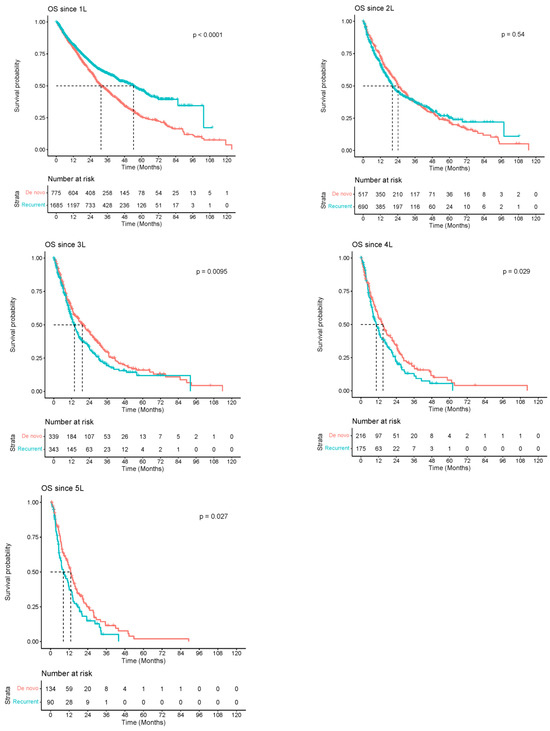In the 1L setting, patients with recurrent BC had a longer median survival of 54.30 months [95% CI, 47.80–61.90] compared to patients with de novo BC, at 31.50 months [95% CI, 28.40–35.90]. However, in subsequent lines of therapy (2L,…, 5L), the median OS was longer among de novo BC compared to recurrent BC (Figure 1).