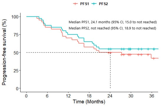 Kaplan–Meier curves of the progression-free survival of 40 ROS1-rearranged NSCLC patients treated with crizotinib. PFS1, denoting the duration from the onset of crizotinib administration to the first observed tumor progression. PFS2, representing the timeframe from starting crizotinib to the progression that led to the termination of crizotinib, even beyond initial progression.