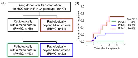 In this study, 77 Japanese patients with HCC who underwent living-donor liver transplantation (LDLT) at the Hiroshima University between 2006 and 2016 were enrolled based on the following inclusion criteria: preoperative diagnosis of HCC and availability of both recipients and donors for KIR genotyping. Of the 77 patients, 38 received adjuvant immunotherapy with donor-liver-derived NK-cell-enriched lymphocytes [7]. This study was approved by the Hiroshima University Research Ethics Committee (Hi-77), and written informed consent was obtained from all patients in accordance with the Declaration of Helsinki. We administered a preconditioning regimen comprising rituximab, tacrolimus, and mycophenolate mofetil combined with double-filtration plasmapheresis to ABO-incompatible patients. After LT, we employed an immunosuppressive protocol, including methylprednisolone and a calcineurin inhibitor (CNI), considering a CNI-sparing regimen with mycophenolate mofetil for patients with chronic kidney disease. Tacrolimus was selected as the standard CNI, but cyclosporin A was selected for patients with HCV infection based on the suppressive capacity for HCV replication [16]. The same immunosuppression protocol was used for recipients with and without immunotherapy. Methylprednisolone was gradually tapered within one year in the absence of an immunological event. Immunosuppression was adjusted depending on whether clinical or biopsy-proven rejection occurred.