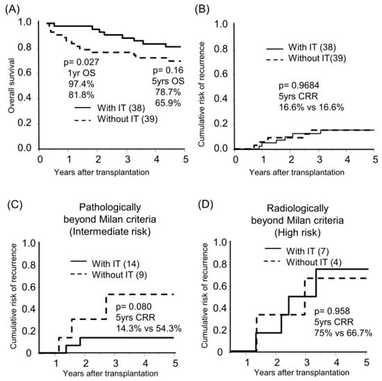 The median follow-up period was 8.3 years. Sixty-six and eleven recipients were categorized radiologically as within and beyond the Milan criteria (MC, single tumor ≤ 5 cm, or up to 3 tumors ≤ 3 cm, without extrahepatic metastases or vascular invasion) by preoperative radiological assessment [18]. By post-transplant histological examination, we defined 23 of 66 radiologically within MC recipients as pathologically beyond MC, in which the histological tumor number or diameter was beyond MC or the presence of microvascular invasion (Figure 1A). The categorized group based on radiological and pathological assessments (pathologically within MC, beyond MC, and radiologically beyond MC) stratified the risk of HCC recurrence after transplantation (5-years CRR; 0%, 25.2%, and 70.4%, respectively; Figure 1B, Table S1). Of the 77 recipients, 38 recipients received adjuvant immunotherapy with donor-liver-derived NK cells. Recipients who received immunotherapy showed significantly better survival in the early post-transplantation period (1-year OS with or without immunotherapy, 97.4% vs. 81.8%, p = 0.027; Figure 2A). The frequency of BSI was significantly lower in recipients who received immunotherapy than in those who did not (2.6% vs. 18.0%, p = 0.020). The CRR were comparable, possibly because of the advanced tumor status in the immunotherapy group (Figure 2B, Table S2). Recipients receiving immunotherapy showed favorable CRR in the subgroup analysis of intermediate recurrence risk, pathologically beyond MC recipients, although the high recurrence risk, radiologically beyond MC recipients, appeared to be far more advanced to benefit from immunotherapy (Figure 2C,D).