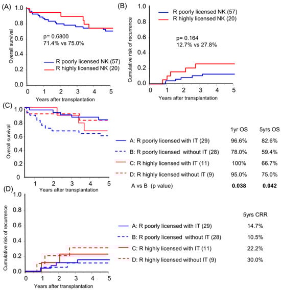 Recipient NK-licensed genotype was associated with susceptibility for immunotherapy with donor-liver-derived NK cells. Kaplan–Meier analyses of the 5-year overall survival (A,C) and cumulative risk of recurrence (B,D) were performed for patients with >3 functional compound KIR-HLA genotypes (R highly licensed NK) and for patients with one or two compound genotypes (R-poorly licensed NK). Subgroup analyses were performed according to immunotherapy (IT/without IT; (C,D)). Statistical analyses were performed using the log-rank test.