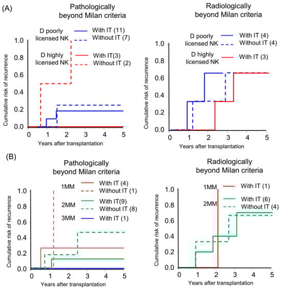 Benefit of immunotherapy with donor liver-derived NK cells on survival and HCC recurrence. Kaplan–Meier analyses of the 5-year overall survival (A) and cumulative risk of recurrence (B–D) were performed according to immunotherapy (with IT/without IT). Analyses were performed for all patients (n = 77, (A,B)), those pathologically beyond the Milan criteria (n = 23, (C)), and those radiologically beyond the Milan criteria (n = 11, (D)). Statistical analyses were performed using the log-rank test.