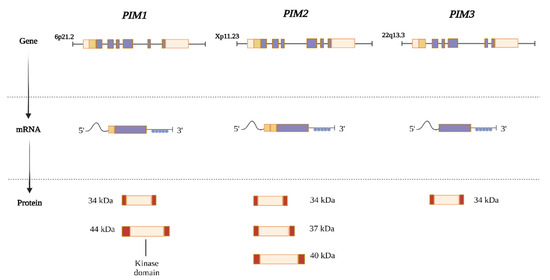The PIM family of genes is located in several chromosomal regions in humans. Exons are indicated by purple boxes, a G/C-rich region (dark orange boxes), and five copies of the AUUUA destabilizing motif in their extensive 5′ and 3′ untranslated regions (UTRs) are depicted as blue circles. Alternative translation initiation sites and extra codons found at the 5′ of these mRNAs are used to generate various protein isoforms (dark orange boxes). Despite having various molecular weights, all PIM protein isoforms still exert serine/threonine kinase activity. PIM family kinases also share a great deal of similarity. PIM1 and PIM3 are 71% identical, and PIM3 shares 44% amino acid sequence homology with PIM1 and PIM2 [23].