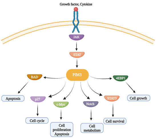 Downstream signaling pathways regulated PIM3 kinase. PIM3 regulates apoptosis, cell cycle, cell proliferation, cell metabolism, cell survival, and cell growth through activation of BAD, p27, c-Myc, Notch, STAT3, and 4EBP1 pathways activation.