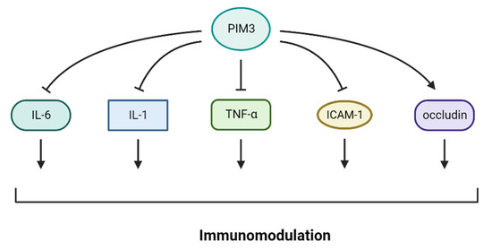 PIM3 regulates immunomodulators. PIM3 inhibits the expression of IL-6, IL-1, TNF-α, and ICAM-1 and encourages the expression of occluding.