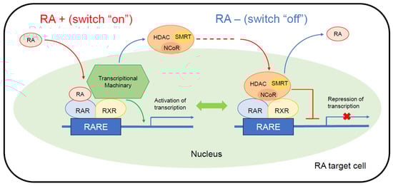 In the absence of RAs as ligands (Figure 2, right), RAR-RXR heterodimers binding to DNA become associated with Co-repressor (CoR) complexes and block transcription. CoR complexes, such as nuclear receptor CoR (NCoR) and silencing mediator of retinoic acid and thyroid hormone receptor (SMRT), serve as adaptors recruiting high molecular weight complexes with histone deacetylase (HDAC) activity. These complexes deacetylate lysine residues in the N-terminal tail of histones and maintain chromatin in a condensed, repressed state over the target promoter [41].