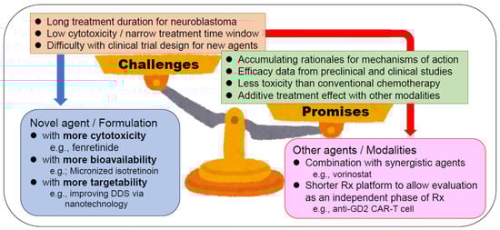 Because there are various other opportunities for using retinoids as neuroblastoma treatment besides maintenance therapy, it may also be applied in consolidation therapy or salvage induction therapy if the agent or regimen is sufficiently effective. There are three potential ways of developing a highly effective treatment, including using (1) an agent with strong cytotoxicity, such as fenretinide; (2) an agent/formulation with excellent bioavailability, such as micronized-isotretinoin; or (3) an agent with fine targetability, possibly via a novel drug delivery system, such as nanoparticles, to reduce adverse effects [61,62].