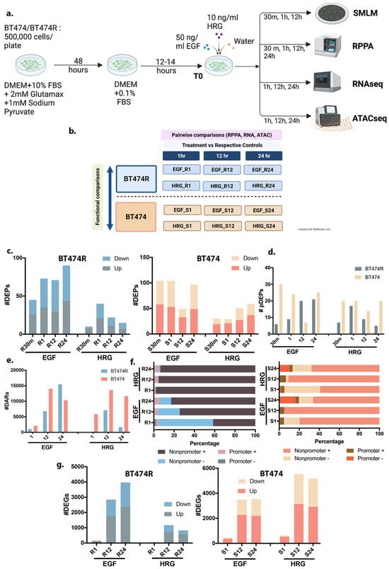 Study design and summary of multiomic measurements. (a) Study design—500,000 cells/well were plated in 6-well plates and cultured for 48 h in complete media with one media change after 24 h. Cells were serum starved using media containing 0.1% FBS for 14–16 h. After serum starvation, cells were treated with 50 ng/mL of epidermal growth factor (EGF), 10 ng/mL of heregulin (HRG), or vehicle (water) in freshly made serum starvation media for 30 min (for RPPA), 1 h, 12 h, or 24 h (for ATAC/RNAseq). Time-zero (T0) samples were collected after serum starvation. All treatments were performed in duplicate. (b) An infographic that highlights the types of comparisons performed within this manuscript. Differential expression (fold change) for each omics data modality (RNAseq, ATACseq, and RPPA) was computed as pairwise comparisons between treatment and their respective control for each time point. The results were then compared between the two cell lines to identify functional differences (functional comparisons). (c) Differentially expressed proteins (DEPs, adj p < 0.05) detected from RPPA measurements for 30 min, 1 h, 12 h, and 24 h for BT474R (R30, R1, R12, and R24, left panel) and sensitive cell line BT474 (S30, S1, S12, and S24, right panel) showed distinct and increased response in BT474 after treatment in contrast to BT474R. (d) A comparison of phosphorylated DEPs, which alludes to a highly active cell state, shows a more robust response in BT474 after both HRG and EGF. (e) A comparison of the differentially accessible regions (DARs) in BT474 and BT474R assessed from the ATACseq data reflected trends similar to DEPs, with BT474 overall being more accessible across time after treatments. (f) The proportion of DARs (as percentage of total DARs) that were observed in the promoter (upstream 1 kb downstream 1 kb of transcription start site (TSS)) and non-promoter regions of annotated genes (adj p < 0.05) for BT474R (left panel) and BT474 (right panel). BT474 clearly showed increased accessibility in its promoter region (compared to their respective control, “+”), especially after EGF. (g) Differentially expressed genes (p adj < 0.05) identified from RNAseq data reflected trends observed in RPPA and ATACseq with both EGF and HRG treated BT474 (right panel) in a transcriptionally more active state compared to BT474R (left panel) across time. Of note, BT474 seems to be most sensitive to treatment at 12 h, as observed.