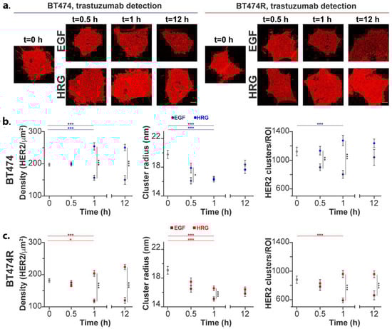 HER2 activity is greatly influenced by the dimerization dynamics with EGFR and HER3/4, as well as its rates of endocytosis and recycling [6]. To better decipher the effect of HER2 activation and downstream signaling changes, we first sought to assess the molecular organization at the membrane using qSMLM. Using a trastuzumab-AF647 probe, we assessed HER2 organization in the starved state (T0) and after treatment with ligands EGF and HRG (see Section 2 for details on qSMLM). To enable robust molecular counting [9], we first determined the photophysical parameters of the fluorescent probe (trastuzumab-AF647) using MDA-MB-468 cells (Figure S4a). Next, using trastuzumab-AF647, we assessed detected HER2 densities and clustering parameters using pair correlation and k-means-like clustering analysis of the SMLM data [9,30,31]. Lateral localization precision distributions are shown in Figure S4b,c. At T0, we saw significantly higher detected HER2 densities in BT474 vs. BT474R (Figure 2 and Table S4). We also observed a significantly higher number of HER2 clusters and fraction of clustered HER2 in BT474 compared to BT474R cells (Table S4). These data are in agreement with our recent work performed in cell lines and patient specimens [8].