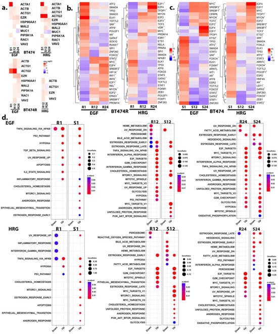 HER2 clustering and downstream signaling. (a) Heatmaps highlight the fold changes observed for genes that are known to affect HER2 organization at the membrane. HRG-treated BT474R shows an absence of significant regulation of several of the transcripts within our data, alluding to altered HER2 membrane organization. (b) Transcription factor (TF)-target activity, as ascertained by DoRothEA, highlights the increased activity of IRF TFs (red) and HIF1A in EGF-treated BT474R, particularly at the later time points. * indicate TF, which were also identified as DEGs at least one time point. (c) A similar DoRothEA TF-target activity heatmap for BT474 treated with EGF and HRG. (d) A comparative dotplot highlighting the Hallmark enrichment identified for BT474R (R1, R12, and R24) and BT474 (S1, S12, and S24) after EGF (upper panels) and HRG (lower panels) treatments. Both (b,c) consistently showed activation of PI3K/AKT signaling in BT474 (adj p < 10−3) and its downstream mTORC1, particularly at early time points.
