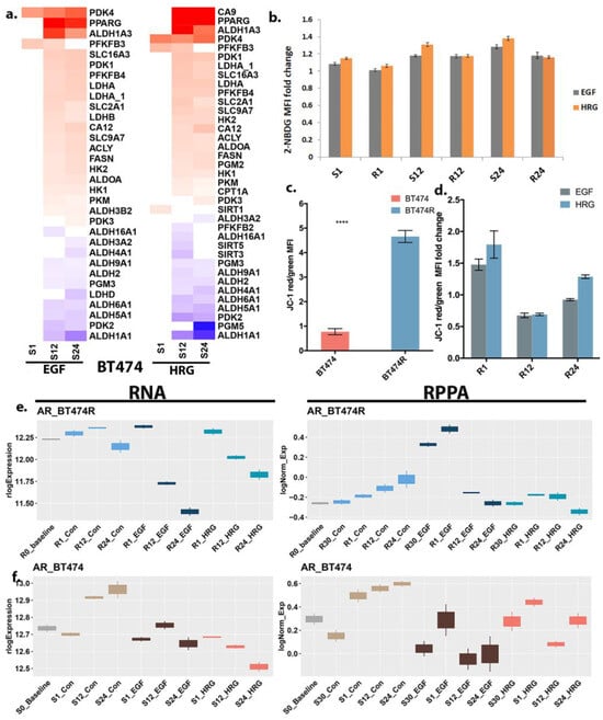 Differential bioenergetics in BT474 and BT474R. (a) Heatmaps highlight the fold changes observed in glycolysis-associated gene products in BT474, with both HRG and EGF-BT474, specifically at the later time points. (b) Glucose (2-NBDG) uptake in BT474R at different time points (R1, R12, and R24) and in BT474 (across time, S1, S12, and S24) after EGF and HRG treatment show a fold change over control. Flow cytometry analysis of serum-starved BT474 incubated with 2-NBDG after treatment for 1 h, 12 h, and 24 h. Error bars represent the SEM of three independent experiments (n = 9). (c) Active mitochondria exhibit brighter red fluorescence signal compared to mitochondria with lower membrane potential, which fluoresce green. Changes in the red/green fluorescence signal ratio can be used to determine healthy versus depolarized mitochondria (mitochondria membrane potential (Δψm)). Bar plot represents the Δψm (JC-1 red/green median fluorescence intensity (MFI)) of serum-starved BT474 and BT474R cells stained with MitoProbe JC-1 (p indicated as **** < 0.0001). (d) Bar plot shows the JC-1 red/green MFI after EGF and HRG treatment for 1 h, 12 h, and 24 h in BT474R (fold change over vehicle). Error bars represent the SEM of three independent experiments (n = 9). (e) RNA and RPPA measurements of AR across all treatment and time point combinations are shown for BT474R. (f) RNA and RPPA measurements of AR across all treatment and time point combinations are shown for BT474.