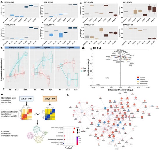 Differential signaling between EGF-BT474R and EGF-BT474. (a) Boxplots of four crucial TFs, IRF1, IRF9, STAT1, and STAT2, in BT474R and BT474, respectively, highlight the increase in expression after EGF treatment. (b) The differential dynamics of these four TFs in BT474 after EGF treatment. (c) Gene abundance signatures of 60 upstream and downstream interactors of IRF1 from custom EGF treatment-specific TF-target/PPI network (see Section 2) clustered into three groups via degPatterns showed a distinctly diverging profile across time for IRF1, STAT1, and associated proteins between EGF and controls in BT474R (also see Table S6). (d) Diff TF analysis for EGF-treated BT474R at 1 h highlighted the role of IRFs, particularly IRF1, as an activator. DiffTF results for 12 h and 24 h after EGF in BT474R are shown in Figure S5. (e) An infographic showing the derivation of differential correlation network for EGF-treated BT474R and BT474. Clustering is performed using a metric called topological overlap measure (see Section 2). (f) The turquoise module with the largest number of differential intramodular edges was identified as being differential between BT474R and BT474. The red edges highlight a positive correlation among genes such as SDC3, CITED2, CD99, PFKFB3, PRDX5, and BDKRB1. Notably, several of these genes have been previously implicated with significant roles in cancer progression and chemoresistance Note: for the edge colors, red indicates higher correlation in BT474R, and blue indicates higher correlation in BT474. For the node colors, red nodes are upregulated by fc value, blue nodes are downregulated by fc value, and green node names are associated with glycolysis. Inset—dotplot of enrichment of the nodes identified in this module.