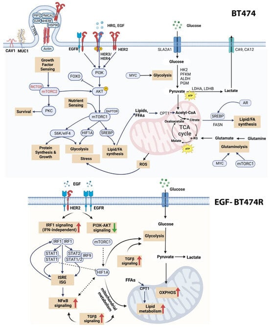 Mechanistic underpinnings of BT474 and BT474R. The top panel represents the major mechanisms observed via our multimodal measurements as being prominent in BT474, irrespective of treatment. We observed an active PI3K/AKT/mTORC1 cascade, evidence of both aerobic and anaerobic glycolysis, increased lipogenesis mediated by AR, and HIF1A-mediated stress response, which also contributes to the metabolic reprogramming in BT474. BT474 shows a mix of substrate utilization for bioenergetics across time and treatments. The bottom panel captures the findings of this study as it pertains to BT474R, particularly after treatment with EGF. BT474R showed inherently high mitochondrial bioenergetics for both ligands but showed a ligand-dependent activation/absence of certain signaling cascades. Only EGF-BT474R displayed increased IFN-independent, IRF1-mediated signaling, which has been reported to be a consequence of EGFR activation. The self-amplification circuit using STAT2, IRFF9, and STAT1 likely contributes to the sustained IRF1 activation across time. The downstream activation of interferon-stimulated genes (ISGs) and interferon-sensitive response element genes could impact cellular bioenergetics through their activation of other signaling cascades, such as NF-κB. STAT1 repression of HIF1A could further contribute to the “flux state” in cellular bioenergetics within EGF-BT474R. As evidenced through our differential co-expression network analysis, an increased correlation of genes in EGF-BT474R associated with hypoxia, NF-κB signaling, and metabolic reprogramming further alludes to the differential bioenergetics with respect to BT474. HRG-BT474R (with respect to control) showed a distinct lack of FASN-mediated lipid metabolism-associated genes, likely mediated by early AR dynamics, and warrants further research.