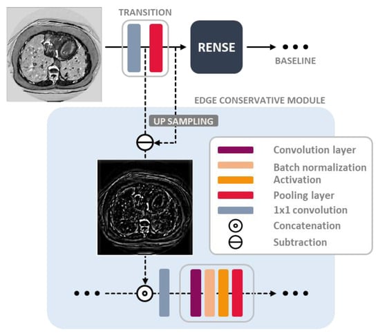 - The edge conservative module was designed in the compensation paths, by preserving the image detail lost from the subsampling (pooling) operation. Auxiliary features were then extracted in this module for better inference.