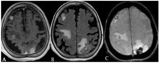 A 65-year-old female with history of papillary thyroid cancer was found to have multiple small enhancing cerebral metastases (A) with perilesional vasogenic edema (FALIR (B)) and hemorrhagic component (SWI (C)).