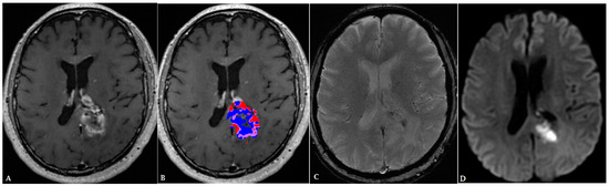 - Kickingereder, P.; Wiestler, B.; Sahm, F.; Heiland, S.; Roethke, M.; Schlemmer, H.-P.; Wick, W.; Bendszus, M.; Radbruch, A.; Jalaguier-Coudray, A.; et al. Primary Central Nervous System Lymphoma and Atypical Glioblastoma: Multiparametric Differentiation by Using Diffusion-, Perfusion-, and Susceptibility-weighted MR Imaging. Radiology 2014, 272, 843–850. [Google Scholar] [CrossRef]