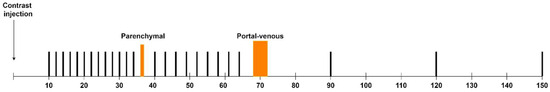 Based on the time bolus, the perfusion series was started 2 s before the arrival time of the measured contrast in the aorta, with 13 acquisitions at 2 s intervals, followed by a diagnostic volume scan in the parenchymal phase at around 35 s and 9 dynamic acquisitions at 3 s intervals. At 70 s, a portal-venous diagnostic helical scan of the thorax and abdomen was performed, followed by three dynamic acquisitions at 90, 120, and 150 s. Only the upper abdomen was included in the perfusion scans and in the diagnostic scan in the parenchymal phase. The complete scan protocol is shown in Figure 1. Combining perfusion CT with diagnostic CT, the interleaved scanning protocol allowed for obtaining both quantitative information and staging information with a single intravenous contrast agent injection. This “one-stop shop” protocol acquired the maximum diagnostic information in a patient-friendly and time- and cost-efficient manner, which facilitates the use of CTP in routine clinical practice [23,24].