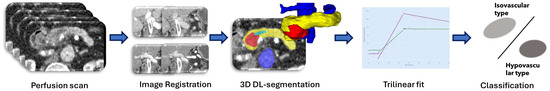 Pancreatic ductal adenocarcinoma (PDAC) is the third leading cause of cancer-related death in the USA. Its prognosis is poor, with a five-year survival rate of 12% [10,11]. The treatment of PDAC poses clinical challenges, especially in tailoring optimal treatment strategies. Prognostication could help in selecting subtypes with different treatment options. Although the majority of tumors are hypoattenuating, a substantial subgroup, ranging from 10 to 20%, is isoattenuating [12,13,14]. Earlier studies demonstrated that isoattenuating tumors showed significantly longer survival after resection [12,15]. However, the detection of isoattenuating tumors is difficult because there is no clear demarcation between tumor tissue and pancreatic parenchyma. Therefore, secondary signs are needed to detect these tumors [13,16]. The quantification of perfusion using CTP can enable the improved classification of these vascular subtypes. This information can be valuable in shared decision-making and associated quality of life.
