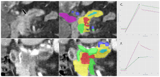 (A): Example of CTP image of a visual isovascular tumor in the coronal plane: no pancreatic lesion is visible, only signs of obstruction of the pancreatic duct (arrow). (B): Tumor (red) as segmented with the deep learning model; other segmentations are pancreas parenchyma (yellow), pancreatic duct (light blue), arteries (dark blue), portomesenteric and splenic veins (green), and the common bile duct (purple) (C): The TICs of the tumor (green) and pancreas (purple) are almost identical, showing similar perfusion in both tumor and pancreas parenchyma. (D,E): Example of a visual hypovascular tumor in the coronal plane with segmentations. (F): The TICs of the tumor (green) and pancreas (purple) with a significantly lower perfusion of the tumor compared with the pancreas parenchyma.