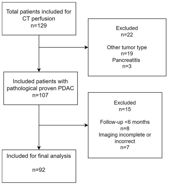 A total of 129 patients with clinical suspicion of pancreatic cancer were included. Of this group, 105 patients had histopathologically proven PDAC; 8 patients were excluded because of incomplete imaging (n = 7) and loss of follow-up within 1 year (n = 2). Therefore, for the final analysis, we included 92 patients with pathologically proven PDAC (mean age 60, 56% men), as shown in Figure 4. The median overall survival was 11.3 months, and the median follow-up period was 11.4 months.
