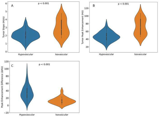 Violin plots showing perfusion features in both visual hypo- and isovascular tumors on the portal-venous phase of CECT. (A) Tumor slope measured in HU/s. (B) Tumor peak enhancement in HU for both tumor slope and tumor peak enhancement; visual isovascular tumors showed higher perfusion values compared with hypovascular tumors, with a significant difference in both features (p < 0.001). (C) Peak enhancement difference between tumor and non-tumorous pancreas parenchyma. Isovascular tumors showed a lower enhancement difference compared with hypovascular tumors, with a significant difference(p < 0.001).