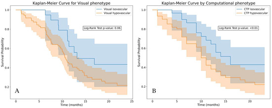 Kaplan–Meier plots of the tumors stratified by vascular type. (A): Based on visual classification, isovascular tumors showed longer survival (p = 0.06). (B): Based on a logistic regression trained on perfusion features (upslope tumor, peak enhancement tumor, and difference in peak enhancement), predicted isovascular tumors showed significantly longer survival (p < 0.01) compared with the predicted hypovascular tumors.