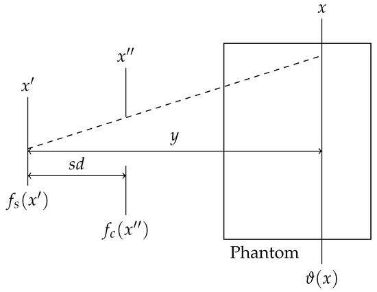 Sketch of the geometry of rays originating from a divergent source at , passing the collimator at the position , which is placed at the distance sd from the source, hitting the phantom at a distance y. The resulting photon fluence is described by . The functions and describe the focal spot of the source and the collimator transmittance, respectively.