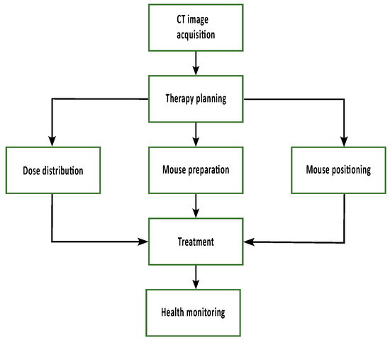 At first, a CT image of the animal is acquired and used for therapy planning. Irradiation parameters, such as field size and beam direction, can be chosen and optimized to ensure target volume coverage. The TPS provides the dose distribution to calculate the irradiation time and the parameters to position the mouse in the field. In preparation for treatment, the animals are injected with glucose, and an eye cream is applied. During treatment, the mice are anesthetized using 2% Isoflurane, and their breathing is observed and regulated by adjusting the isoflurane concentration during treatment. After irradiation, a health check is performed.