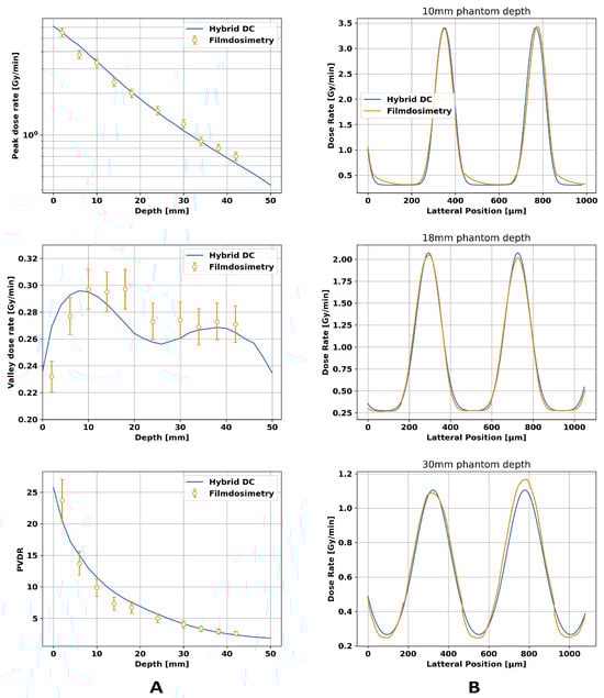 Comparison between film dosimetry and the hybrid dose calculation algorithm for a 20 × 20 mm2 microbeam field hitting a 100 × 54 × 54 mm3 PMMA phantom. Column (A) displays the depth-dependent values for peak dose, valley dose, and peak-to-valley dose ratio (PVDR), while column (B) presents the dose profiles at different depths.