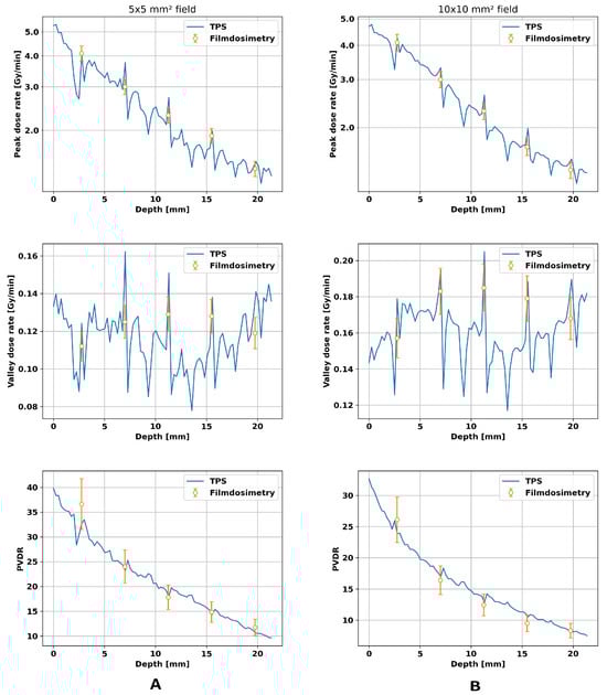 Comparison of film dosimetry with the TPS for a 5 × 5 mm2 field in the column (A) and for a 10 × 10 mm2 field in column (B). Both fields hit a 20 × 10 × 20 mm3 PMMA phantom placed on the mouse bed, and in both cases, the peak- and valley dose rates and the PVDRs were compared. For dose calculation, a CT image of the phantom with the EBT3 films inside was acquired and fed into the algorithm. The local fluctuations in the calculated dose rate by the TPS correspond to the position of the film in the phantom. The peak-to-valley dose ratio is abbreviated as PVDR.