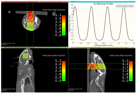 Figure 6 shows the resulting treatment plan for the mouse irradiation. The beam, which is outlined in green in the images, penetrates through the mouse bed and the lower part of the mouse head before reaching the brain. The resulting peak dose rate is shown as an overlay to the CT image, which decreases with depth in the mouse but locally rises in denser material like bone. By computing the mean dose rate values in the targeted brain area, the peak dose rate was found to be 2.3 Gy min−1, and the valley dose rate was 0.14 Gy min−1, leading to a mean PVDR of 16 with the FWHM of the individual microbeams being 138 separated by a ctc of 430 . Since we targeted for a peak dose of 20 in the brain, the mouse was irradiated for 522 .
