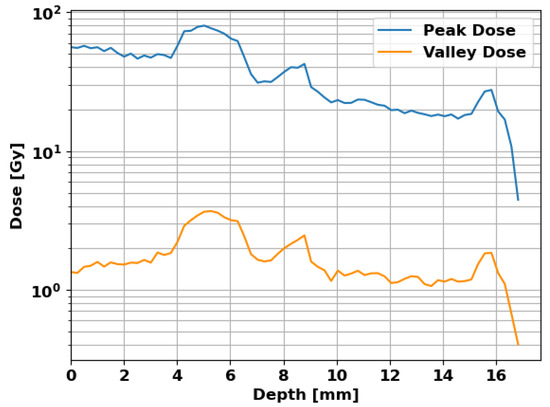 Figure 7 shows the peak and valley doses against depth in the mouse in the beam direction. The peak dose shows a decreasing trend over depth with local rises in the bone, which are observed in the valley dose as well. For the targeted brain area at a depth between 9 and 15 , the peak dose is 20 as intended and the valley dose is .