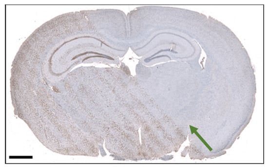Section of the mouse brain after microbeam irradiation and stained with H2AX labeling. The scale bar is 1 mm. The green arrow indicates the beam direction.