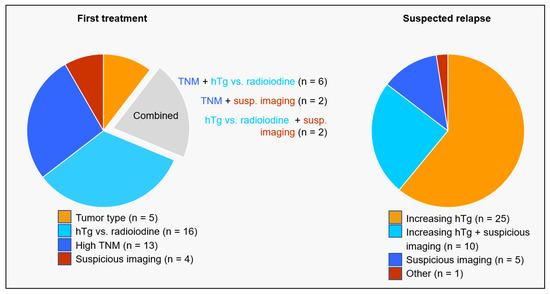 Reasons leading to a PET/CT examination at initial staging as recorded by referring physicians were aggressive tumor type (poorly differentiated thyroid carcinoma), a high TNM stage (distant metastases, M1, or lymph node-positive, locally advanced tumor stage, T4 N+), image findings suspicious for iodine-negative tumor prior or during radioiodine treatment, or mismatch between hTg level and radioiodine imaging as well as an inadequate decline in hTg after radioiodine treatment; see also Figure 1.