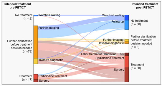 Changes in treatment concept due to PET/CT findings. Overview of the influence of PET/CT on planned patient treatment: The left side depicts the treatment plan before PET/CT, while the right side shows the plan after PET/CT. Colored bars and their strength represent the flow of patients between treatment groups. Pre-PET/CT, there were few cases with a defined treatment plan (watchful waiting: n = 2, radioiodine treatment: n = 11, surgery: n = 6). Most cases required further clarification via imaging (n = 68) or invasive diagnostics (n = 11). PET/CT results prompted referring physicians to change patient management in many cases, allowing the definition of treatment strategies (watchful waiting: n = 10, follow-up: n = 20, radioiodine treatment: n = 24, surgery: n = 27, other or combined treatment: n = 9) with only 8 cases needing further clarification. Additionally, in 32% of cases with an intended treatment plan before PET/CT, adjustments were made, including significant changes for three patients (from no treatment to treatment: n = 1, or treatment to no treatment: n = 2).