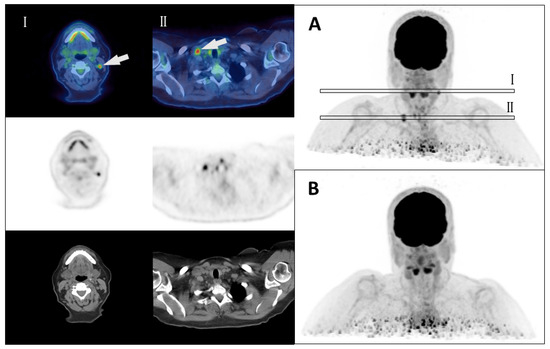 Example of pre- and post-therapeutic [18F]FDG-PET/CT findings. Pretherapeutic [18F]FDG-PET/CT imaging (A) shows multiple focal FDG lesions (n = 5) classified as lymph node metastases in a patient with high-risk papillary thyroid cancer (T3, N1, R1) in the 3D-PET-reconstruction. Two of these metastases are marked with a white arrow in cross-sections (I) and (II). Decision for PET/CT was made due to a mismatch of a high hTg Level of 72.5 ng/mL (endogen TSH stimulation) and only little iodine-avid tissue in the first radioiodine treatment. Following PET/CT, a cervical lymph node dissection was performed confirming multiple lymph node metastases (n = 6). A second [18F]FDG-PET/CT imaging after surgery demonstrated the absence of any FDG-avid lesions (B) and hTg dropped below the detection limit until the end of the follow-up period (73 month from resection).