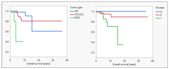 Patients with PDTC had a significantly shorter OS since first tumor diagnosis (median OS, 3.9 years, p = 0.002) compared to those with FTC/HTC and PTC. A similar difference was seen for patients with distant metastases at first diagnosis (median OS, 15.2 years, p = 0.03); see also Figure 4. There was also a trend for differences in OS in the dependence of risk classification according to the ATA, but this was not significant probably due to unequal distribution within the groups.