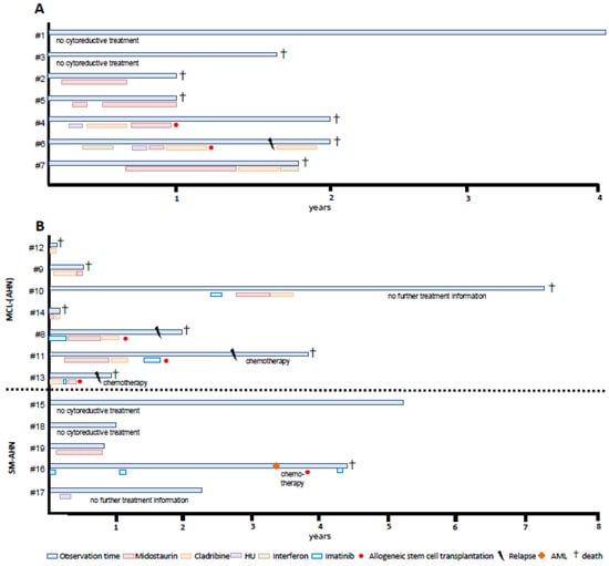 Additional somatic high-risk mutations (HRM) in SRSF2, ASXL1, RUNX1 (S/A/R gene panel) [6], NRAS or DNMT3A [4,16] were identified in 2/7 (29%) patients (SRSF2, n = 1; NRAS, n = 1) and other somatic mutations (TET2, JAK2, and CBL) [5] were observed in two patients (29%; CBL/TET2, 1/7; JAK2 V617F, 1/7). Due to the paucity of leukocytosis ≥ 16 × 109/L (0/7), skin involvement (0/7) and HRM (2/7), almost all patients were low/intermediate risk according to current prognostic scoring systems for AdvSM (IPSM, 7/7; MARS, 6/7; MAPS, 5/7; GPS, 6/7) (Figure A1).