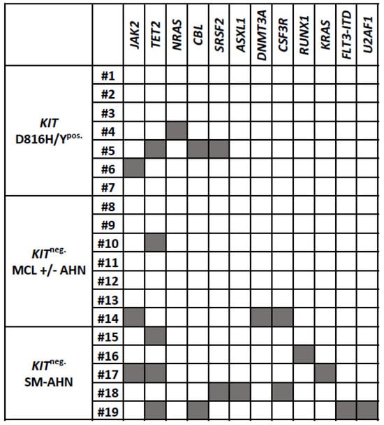 - Naumann, N.; Lübke, J.; Shomali, W.; Reiter, L.; Horny, H.P.; Jawhar, M.; Dangelo, V.; Fabarius, A.; Metzgeroth, G.; Kreil, S.; et al. Clinical and histopathological features of myeloid neoplasms with concurrent Janus kinase 2 (JAK2) V617F and KIT proto-oncogene, receptor tyrosine kinase (KIT) D816V mutations. Br. J. Haematol. 2021, 194, 344–354. [Google Scholar] [CrossRef] [PubMed]